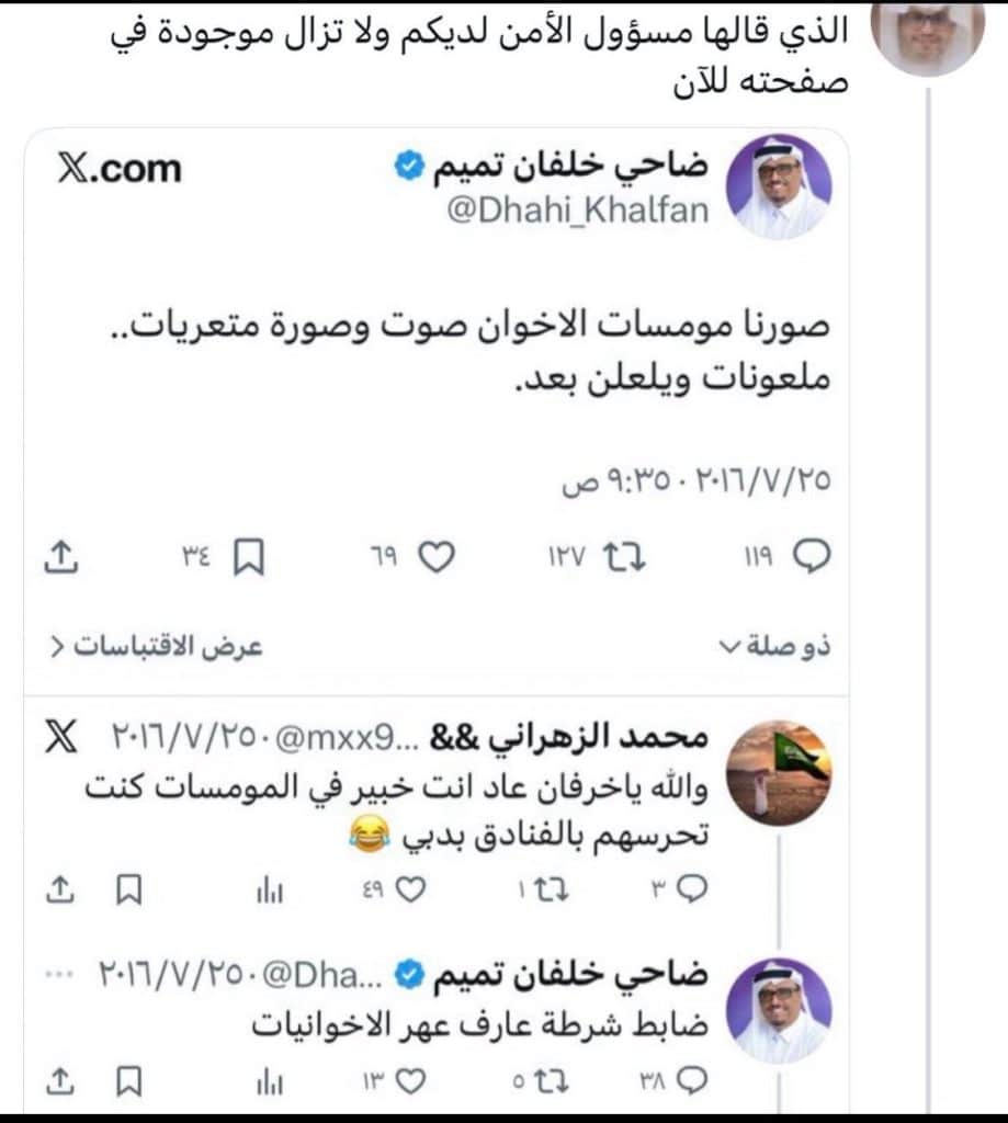 في الصورة المتداولة، تظهر تغريدة منسوبة إلى ضاحي خلفان يتحدث فيها بلهجة حادة عن “تصوير مؤسسات الإخوان صوتًا وصورة”، في سياق ردود على متابعين. كما تظهر ردود متبادلة بين حسابات أخرى، تتضمن سخرية وتهديدًا ضمنيًا، وهو ما اعتبره ناشطون إيحاءً بامتلاك تسجيلات أو أدوات مراقبة.