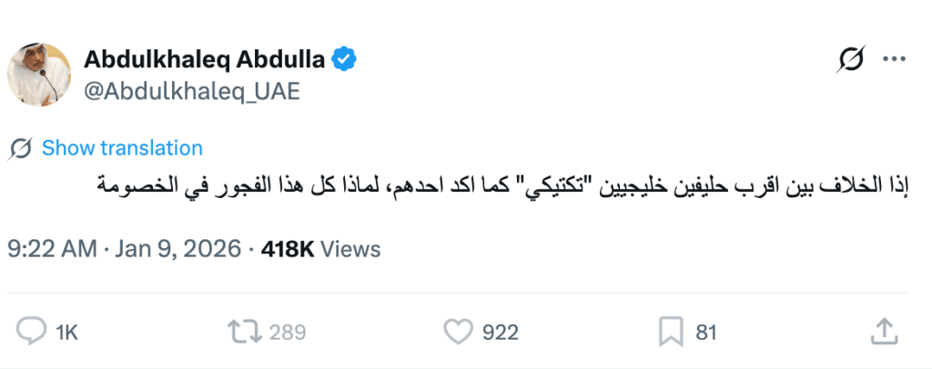 السؤال، الذي بدا محاولة لتخفيف حدّة ما يجري بين السعودية و**الإمارات**، انقلب سريعًا إلى مادة اتهام مباشرة، إذ رأى كثير من المتفاعلين أن التغريدة لا تسأل بقدر ما تتجاهل جوهر الأزمة وتحاول إعادة توصيفها على أنها “خلاف تكتيكي” لا أكثر.